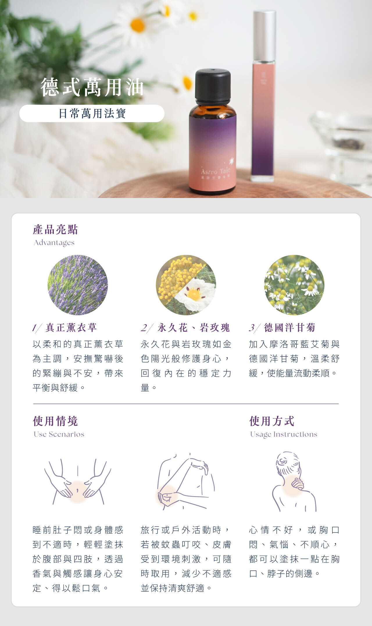 成份:金黃荷荷芭油、永久花、德國洋甘菊、真正薰衣草、岩玫瑰
