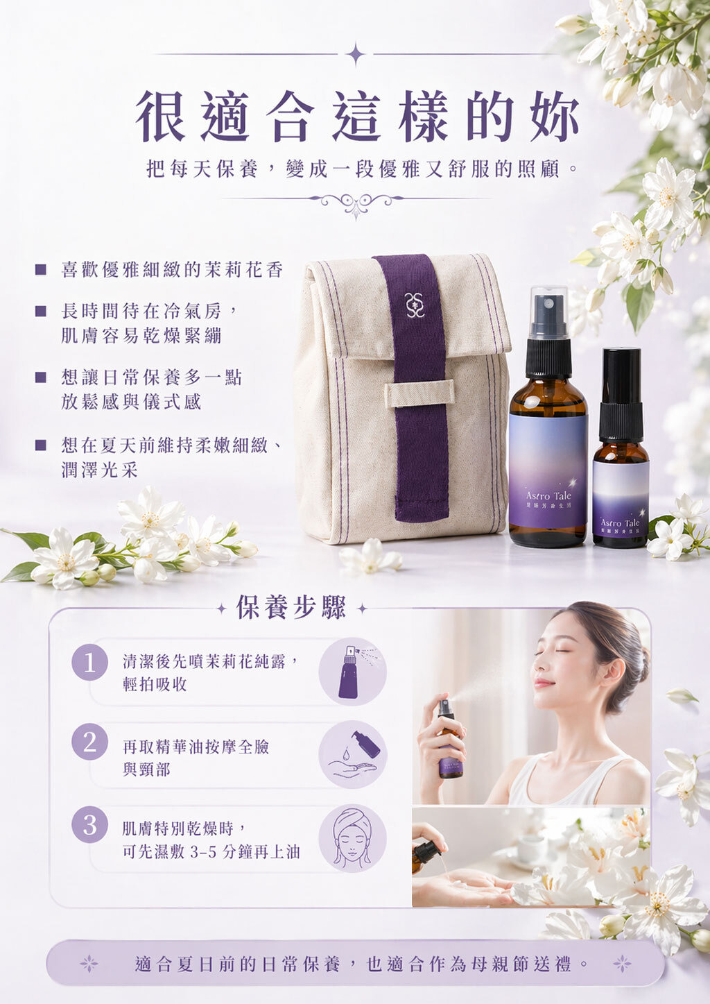 ■ 喜歡優雅細緻的茉莉花香,想讓每天保養多一點放鬆感與儀式感時,很適合早晚保養使用。