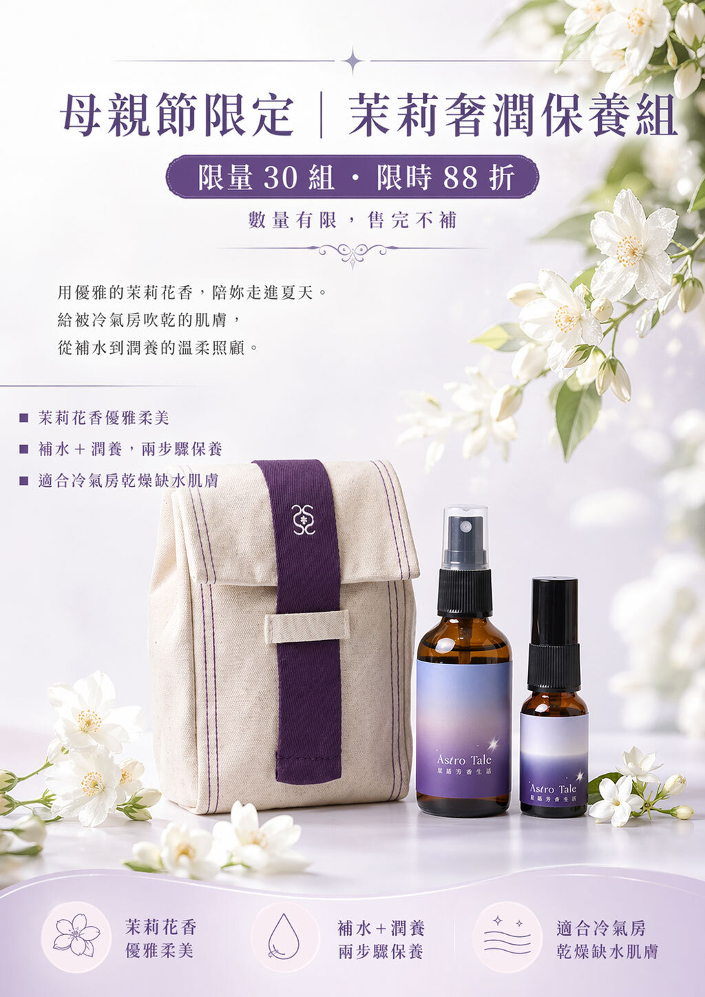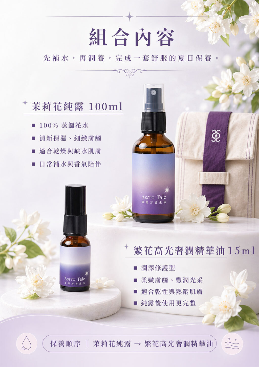 茉莉奢潤保養組,將清新柔雅的茉莉花純露,搭配質地豐潤細緻的繁花高光奢潤精華油,從第一步補充水分,到後續鎖住潤澤,讓肌膚感受到更完整的照顧。